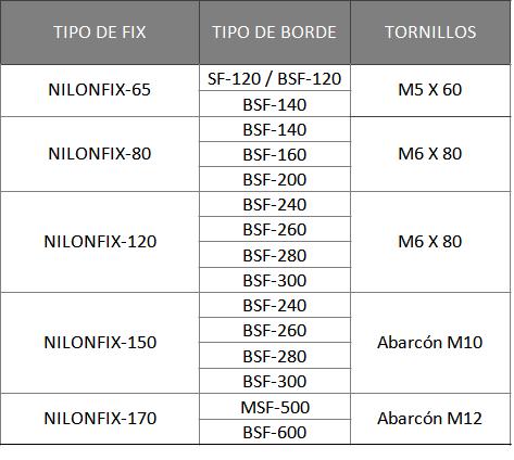 Cada juego de FIX está compuesto por dos piezas de nylon o acero, dependiendo del tipo y 4 tornillos galvanizados. Su elección depende del borde de contención utilizado.