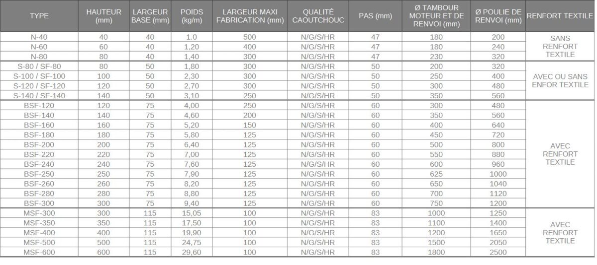 Selon les qualités de caoutchouc utilisées et les dimensions de la bande, cette règle générale peut varier. Nous recommandons une étude technique spécifique pour chaque projet.